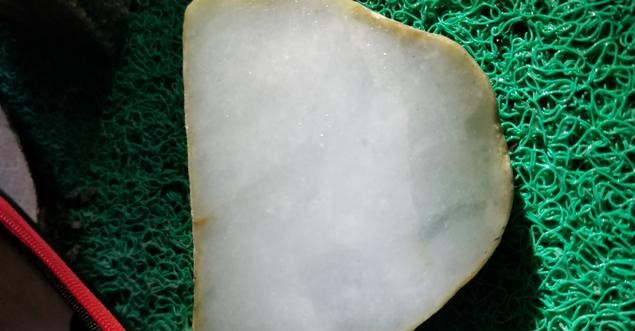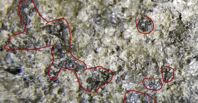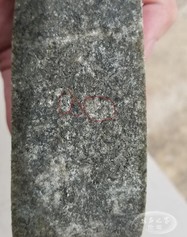 今天来给大家分享一下,如何通过看皮壳砂粒的粗细来判断内部晶体颗粒的粗细。在行业内有一句话,叫做砂粗肉粗,砂细肉细。这句话,其实相对于大多数情况都是适合的。今天就来详细地给大家讲讲皮壳砂粒表现与肉质的关系 。先来看看一块翡翠原石(图1)。 大家可以看到这一块翡翠原石,这一块,我是特意买来切开来给大家做教程的。很明显看到这个皮壳砂粒给人的感觉就是不紧凑,比较松散。再来近距离看看这个皮壳的砂粒的表现。这张局部的皮壳图(图2),就可以很清晰地看清了砂粒的表现了。很明显皮壳上的砂粒是很粗的,并且这个砂粒与砂粒之间隙较大,大家可以看到红色线条的地方,都是因为砂粒与砂粒之间的间隔过大,松散。翻砂不均匀,砂粒也不坚硬。